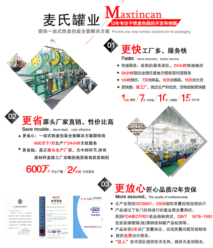 保健酒鐵盒加工廠——清遠市麥氏罐業多年來以的產品、誠信的服務深受廣大商家客戶的青睞。提供的產品質量上乘、價格合理,鐵盒產品多年通過ISO、SGS等機構測試,為您提供的鐵盒包裝產品。