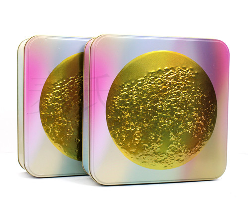 此款四塊裝中秋月餅鐵罐的表面印刷制作為PMS專色+CMYK四色專版印刷。而版面設計創意新穎,更符合了當前年輕化包裝的發展需求。鐵罐在印刷面上還罩上了一層亮光油效果質感,內部亦此。過油的目的是為了提升鐵罐外觀質感外,還提升了鐵罐的保護能力。使得盒子整體表現的更加帶起,真正體現出外包裝所帶來的高市場價值。