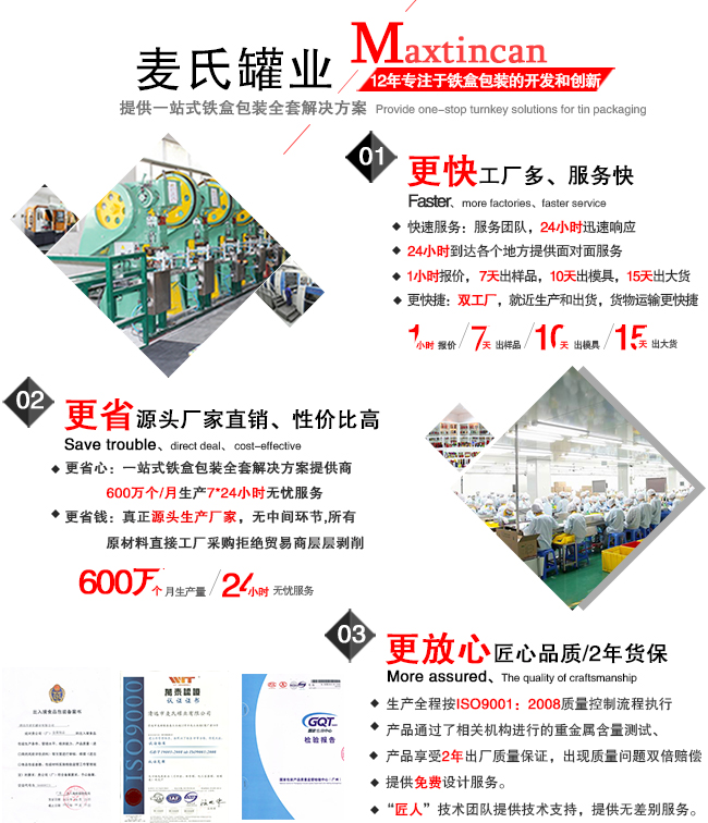 一般情況下,麥?zhǔn)瞎迾I(yè)采用0.23MM厚度的馬口鐵作為鐵料,同樣可可以選擇鍍鋅鐵、磨砂鐵等鐵料。厚度可控制在0.20MM~0.30MM之間、如想需要特殊鐵料或規(guī)格,請聯(lián)系麥?zhǔn)瞎迾I(yè)的銷售人員,我們會盡情為您一一講解。